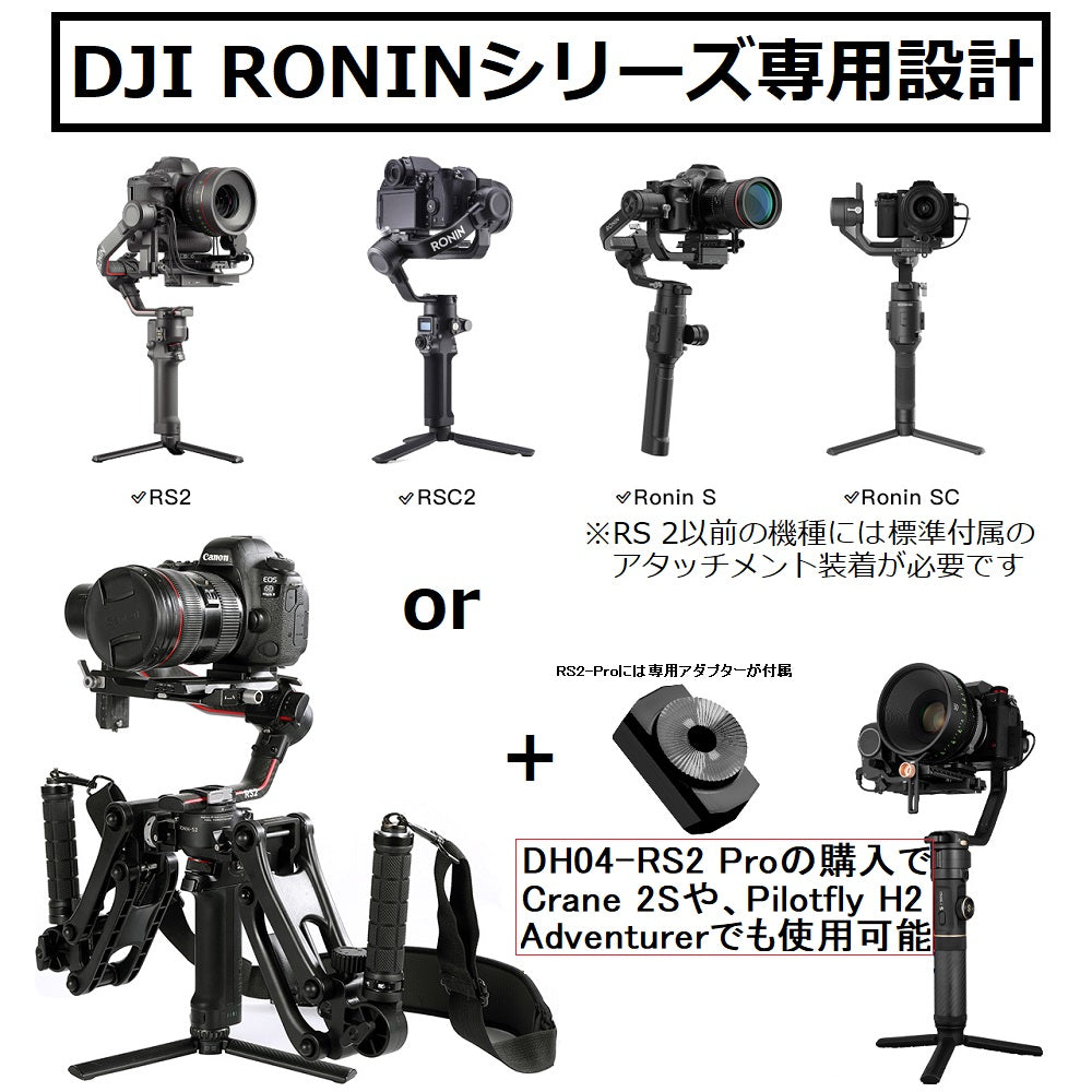 - DH04-RS2はDJI RONINシリーズに特化した専用仕様となります。DJI社の片手持ちRONINシリーズ全般、最新のRS3にも対応しペイロード2~8kgまでの搭載重量範囲でスタビライザーでは抑制できない縦揺れのブレを低減します。RONINシリーズでに共通使用可能ですが、両手持ちのRONIN-MやRONIN-4Dには対応しておりません。
