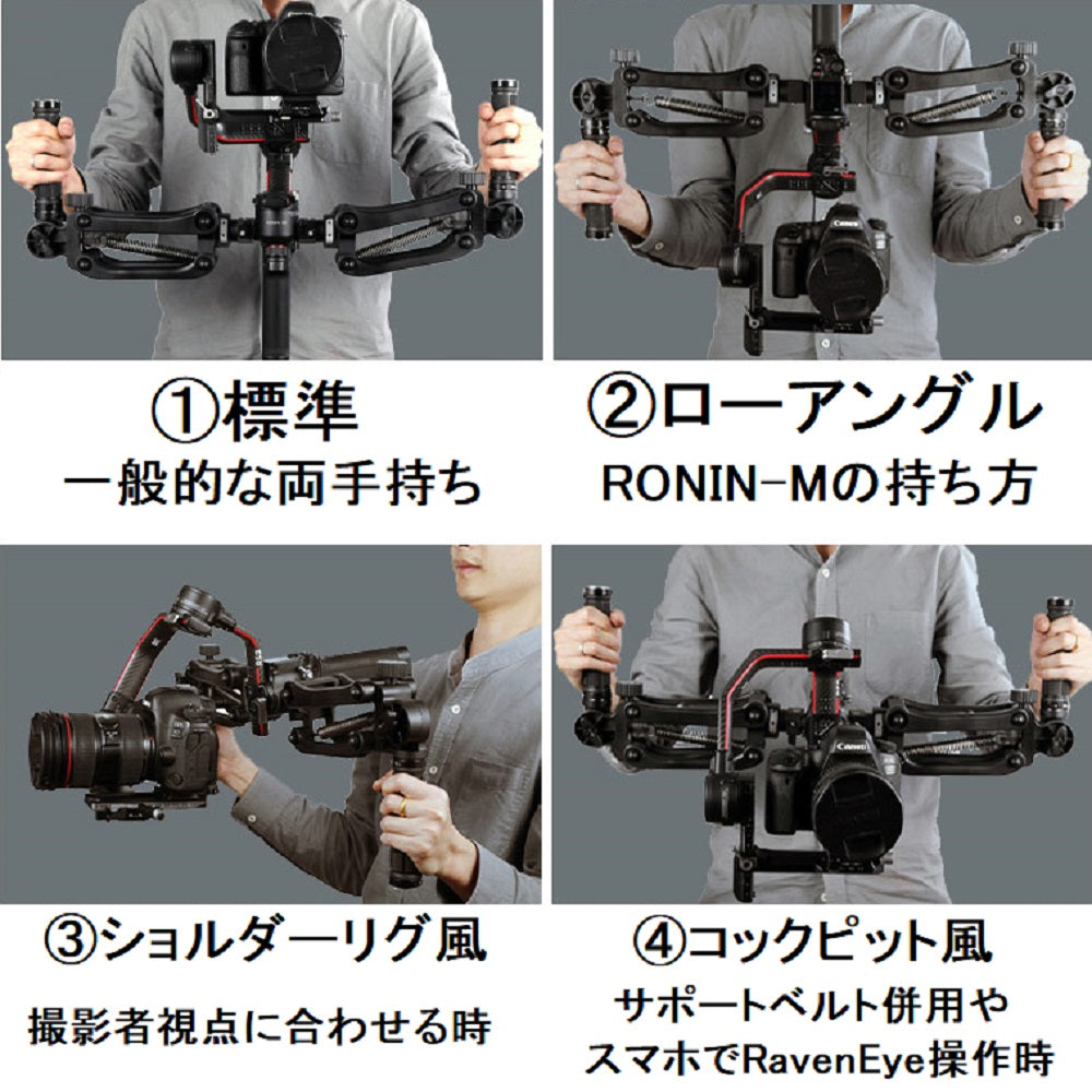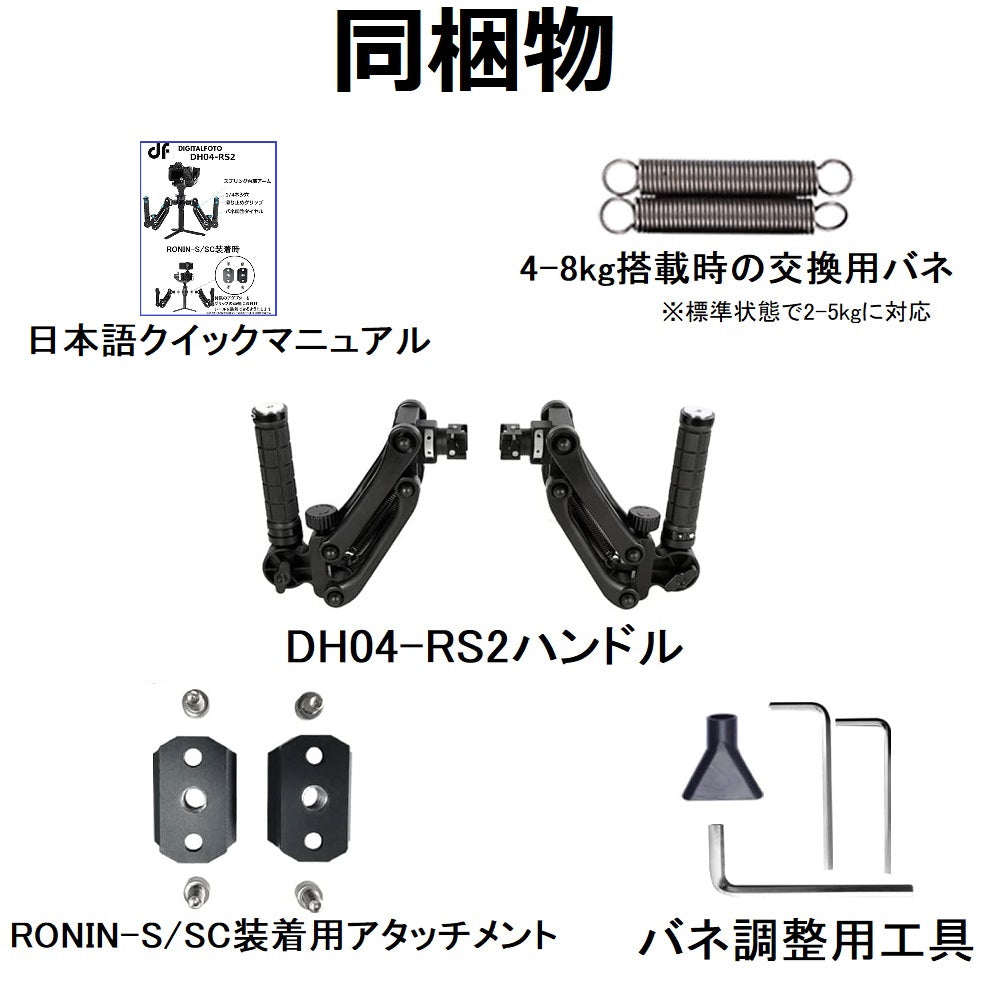 - DH04 Proは汎用で様々なジンバルに対応しますがDH04-RS2はRONINシリーズ用の専用設計となります。DH04 Proでは不可能だった横向きでのデュアルハンドルと縦揺れ抑制の両手持ちがDH04-RS2で使用可能になりました。水平状態でのスプリングによる縦揺れ低減や、グリップの上下を入れ替えれば、ショルダーリグのようにして使用する事もできます。