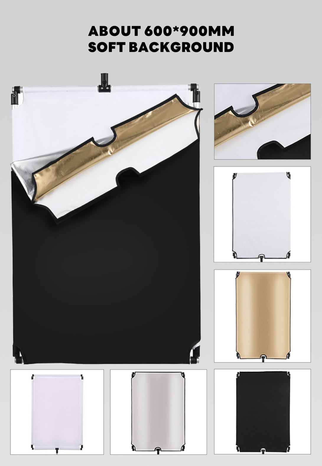 - 30cm×60cmのレフ板の他に90cm×60cmの布製の背景フラッグが5枚付属します。